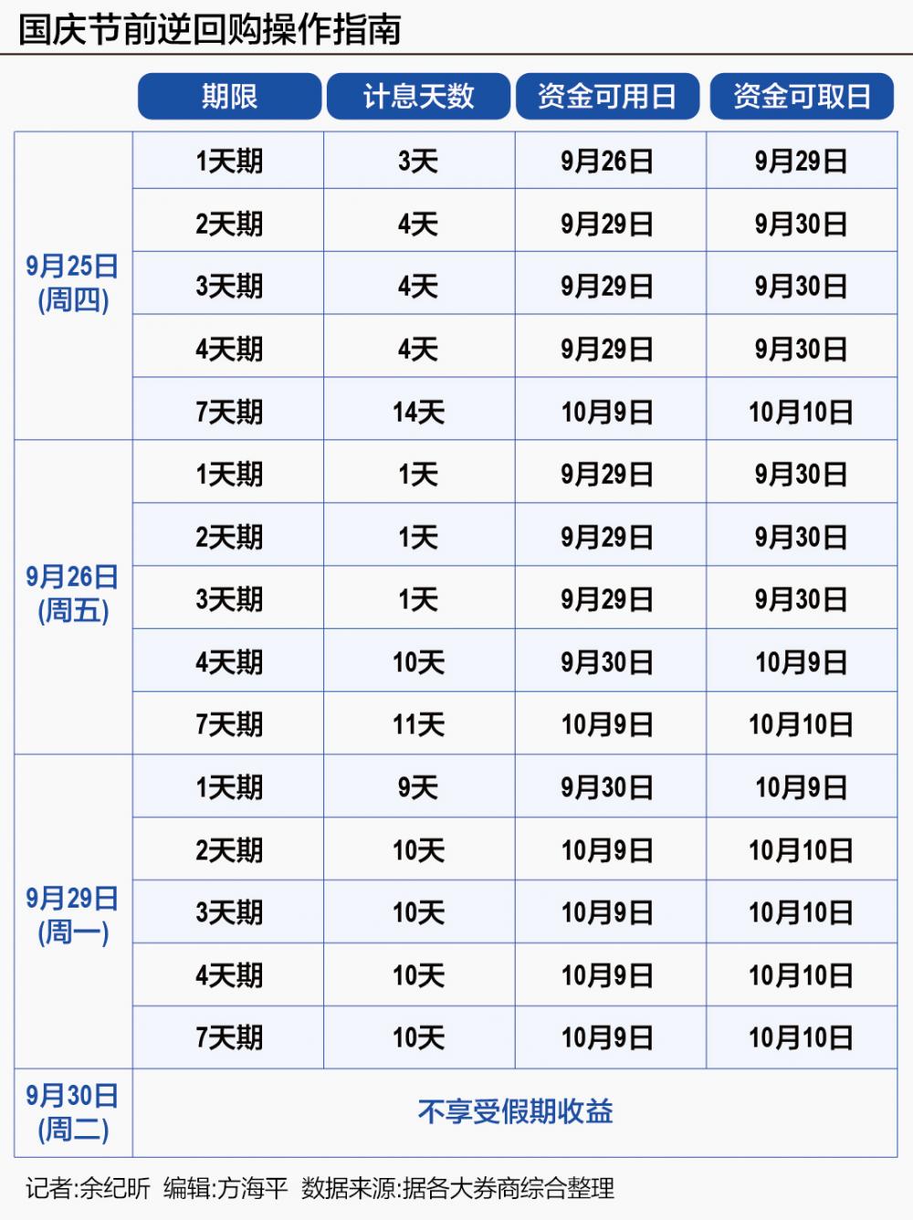 需要特别留心的是,9月30日作为节前最后一个交易日,此时参与逆回购无法享受假期收益,资金实际占款天数仅为7天却只能获得1天利息,故对投资者来说性价比可谓“大打折扣”。