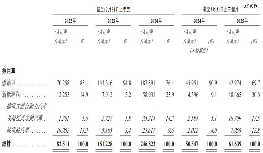 以燃油车起家的奇瑞汽车,如今新能源汽车业务营收也正在快速攀升。招股书披露,2025年前3个月,新能源汽车中来自插电式混合动力汽车及增程式电动汽车收入为107亿元,上年同期为25.84亿元,同比激增314%,同时占乘用车营收比例提升至17.5%;来自纯电动汽车收入为79.56亿元,上年同期为20.12亿元,同比大增295%,占乘用车营收比例则提升至12.8%。