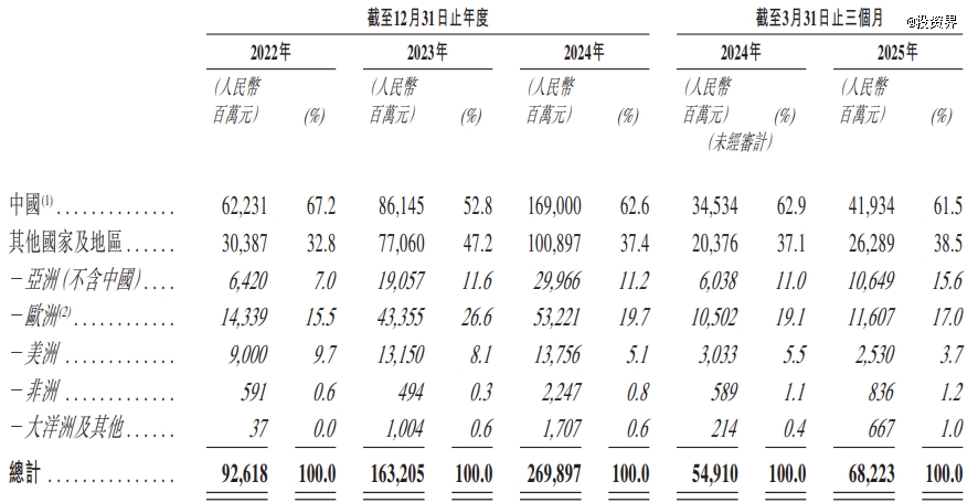 数据显示,奇瑞汽车自2003年起连续22年位居中国自主品牌乘用车公司出口量第一,海外市场营收令人印象深刻。招股书显示,2022年到2024年,海外市场营收分别为303.87亿元、770.6亿元和1008.97亿元,占总营业收入的32.8%、47.2%、37.4%。今年一季度的海外营收规模依旧呈现增长趋势,达到262.89亿元,占总营收比例从2024年一季度的37.1%增长到38.5%。