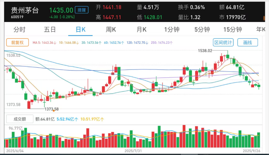 资本市场上,贵州茅台股价近期持续走弱。9月26日,股价一度探至1428.01元,创8月19日以来新低;截至收盘,贵州茅台报1435元/股,微跌0.28%,总市值1.8万亿元;自9月12日冲高回落以来,公司股价累计跌幅达5.81%,而同期上证指数和上证50的跌幅仅1.22%和1.41%,沪深300还上涨了0.04%。