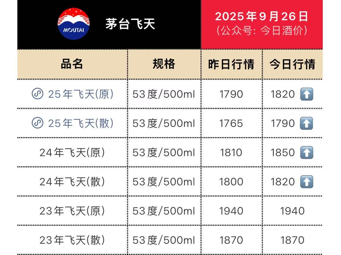 9月24日,25年飞天茅台原箱和散瓶双双“回暖”,当天25年飞天茅台原箱报1790元/瓶,较上一日涨30元;散瓶报1765元/瓶,较上一日涨25元。9月25日,价格与上一日持平;9月26日再次上涨。按最新的报价计算,25年飞天茅台原箱较低位涨幅3.41%、散瓶较低位上涨2.87%。