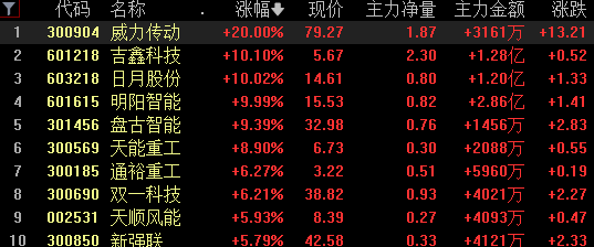 威力传动20cm涨停,明阳智能涨停,吉鑫科技、大金重工、通裕重工、等跟涨。