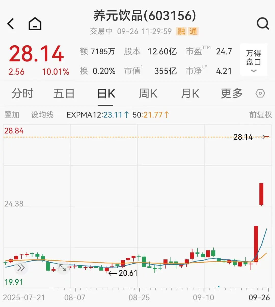 9月26日,“六个核桃”母公司养元饮品一字涨停,报28.14元/股,总市值来到355亿元,实现三连板。