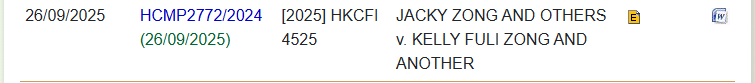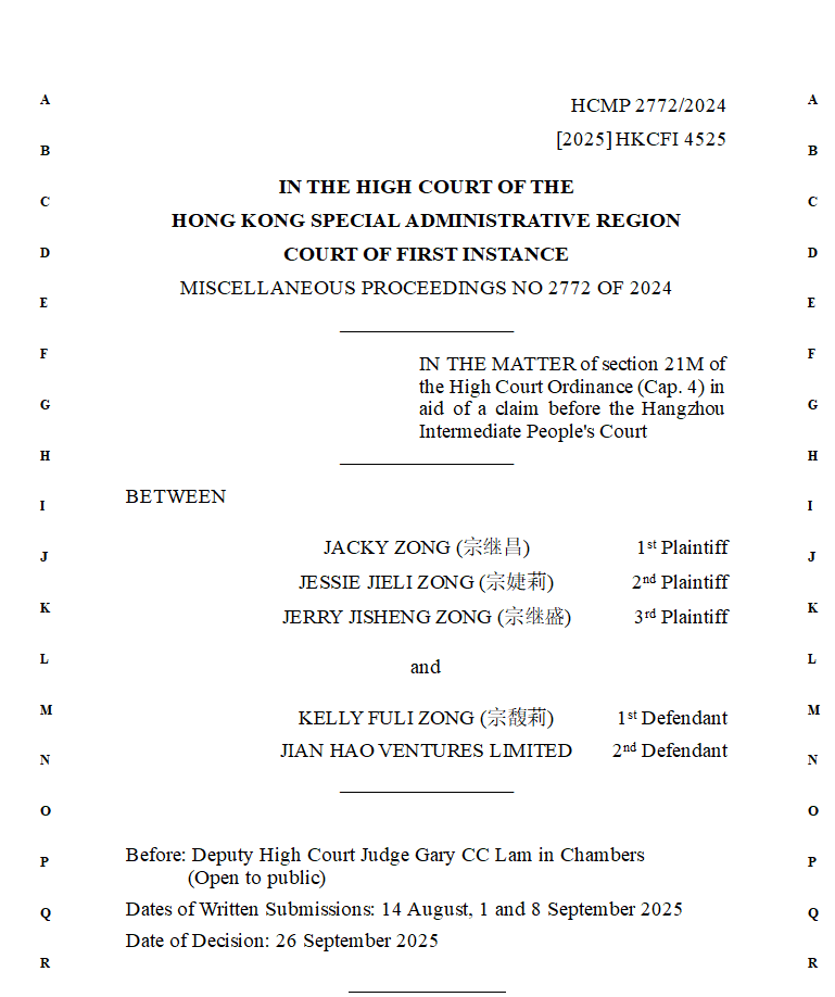 2024年12月,宗继昌等原告三人在中国杭州中院提起诉讼,要求确认其对被告控制的汇丰银行账户资产享有信托权益。为协助诉讼,原告向香港法院申请临时禁令及披露令,以防止处于香港汇丰银行的资产被转移。