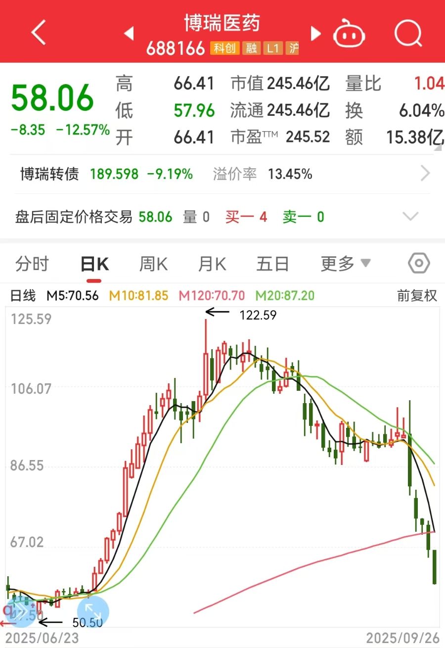 董事长提议回购背后,源于博瑞医药股价近期持续下跌。9月22日,全球制药巨头辉瑞宣布以最高73亿美元收购美国生物技术公司Metsera,后者专注于GLP-1类肥胖与代谢疾病药物研发。消息一出,A股减肥药概念股集体跳水,博瑞医药首当其冲。辉瑞完成对Metsera的收购后,市场担忧国内减肥药企业潜在买家减少,BD(业务发展)预期落空,导致博瑞医药等企业股价重估。 9月24日晚间,博瑞医药因股票连续30个交易日内收盘价格跌幅偏离值累计达到70%,发布股价异动公告。9月25日,博瑞医药股价继续大幅下挫超8%。9月26日,博瑞医药收跌12.57%,收盘价为58.06元/股。本周,博瑞医药股价累计下跌38.36%,总市值缩水至245.46亿元。