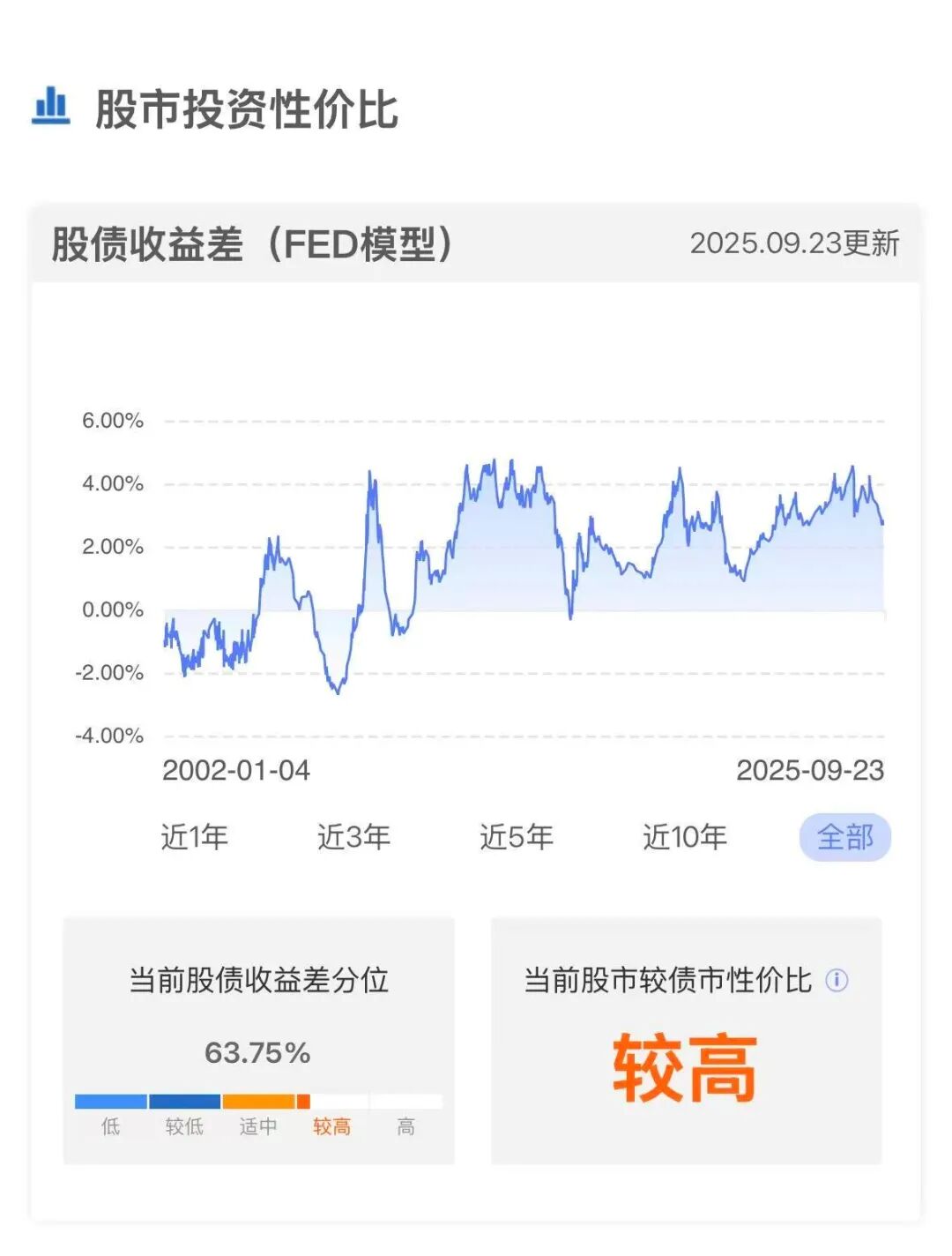 截止今年9月23日,股债收益差为2.65%,仍高于历史上63.75%的交易日,股市相对债市的投资性价比或仍然较高。
