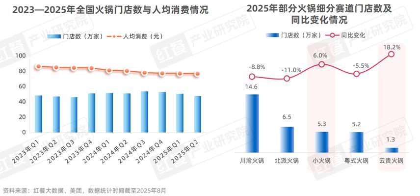 与此同时,在性价比消费需求增长的趋势下,火锅人均消费持续下滑。红餐大数据显示,截至2025年8月,全国火锅门店人均消费已降至76.7元,较2023年第一季度(86.5元)下降了11.3%。