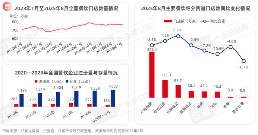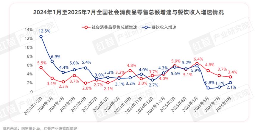 国家统计局数据显示,2025年1月至8月,全国餐饮收入为3.6万亿元,同比增长3.6%,增速较2024年同期下降3个百分点,其中2025年6月和7月的同比增速仅为0.9%和1.1%。