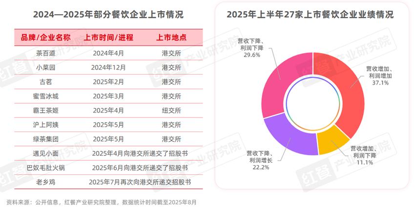 2025年,餐饮各赛道头部品牌通过港股、美股等资本市场加速资本化进程。其中,蜜雪冰城、古茗、沪上阿姨、绿茶集团等企业陆续在港交所挂牌上市,霸王茶姬则成功登陆纽交所,遇见小面、巴奴毛肚火锅、老乡鸡等企业也正在冲刺港股IPO,餐饮行业迎来了“上市潮”。然而,上市也不意味着一劳永逸。据红餐产业研究院不完全统计,2025年上半年,27家上市餐饮企业中有6家企业是亏损状态,而29.6%的企业遭遇了营收与利润的双重下滑。