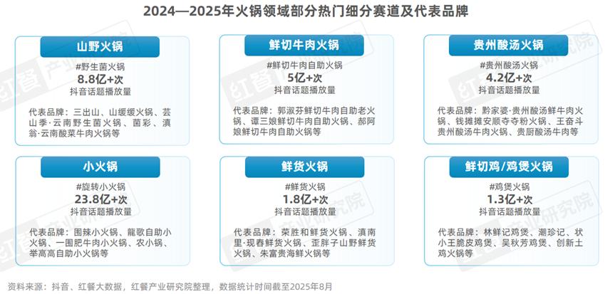 从细分赛道来看,主流的川渝火锅、北派火锅和粤式火锅的门店数均有不同程度的下降,而小火锅、云贵火锅的门店数则逆势增长,同比增幅分别为6.0%和18.2%。此外,还有一些新的热门细分赛道涌现,如山野火锅、贵州酸汤火锅、鲜切牛肉火锅、鲜切鸡/鸡煲火锅、鲜货火锅等。其中,小火锅和山野火锅的表现较为亮眼,截至2025年8月,抖音平台上“旋转小火锅”“野生菌火锅”话题的视频播放量分别超过了23.8亿次和8.8亿次。