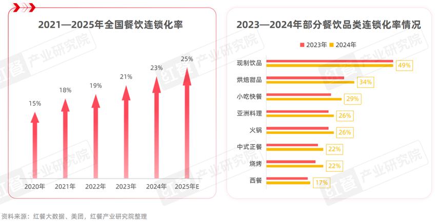 近年来,我国餐饮行业的连锁化进程持续加速。据美团数据,全国餐饮连锁化率从2020年的15%稳步上升至2024年的23%。预计2025年餐饮连锁化率将进一步提升至25%左右。