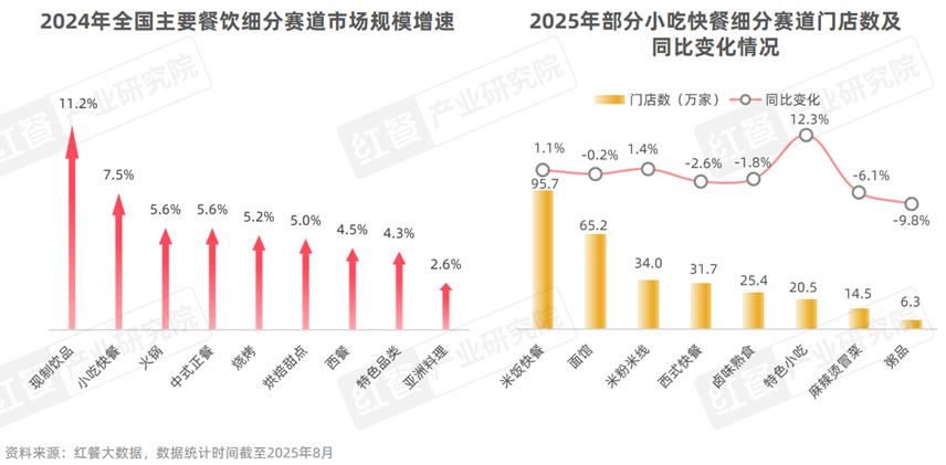 近年来,受性价比消费需求攀升的驱动,小吃快餐成为餐饮市场中除饮品外增长最快的细分品类。红餐大数据显示,2024年小吃快餐市场规模达到10,075亿元,同比增长7.5%,截至2025年8月,全国小吃快餐门店约350万家,预计2025年市场规模将增长至1.08万亿元。