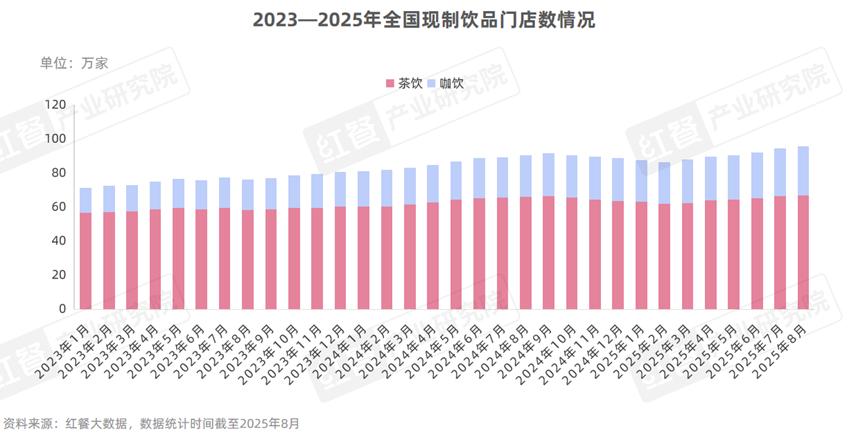 现制饮品是近年来餐饮市场增长最快的品类之一,红餐大数据显示,2024年全国现制饮品市场规模达到2,968亿元,同比增长11.2%,截至2025年8月,现制饮品门店数已超过95万家,同比增长5.7%。