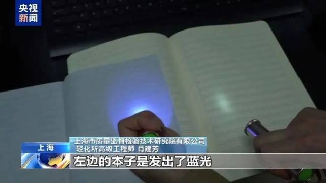 上海市质量监督检验技术研究院有限公司轻化所高级工程师 肖建芳:我教大家一个小窍门,通过荧光剂的检测手电筒可以看作业本中是否含有荧光增白剂。