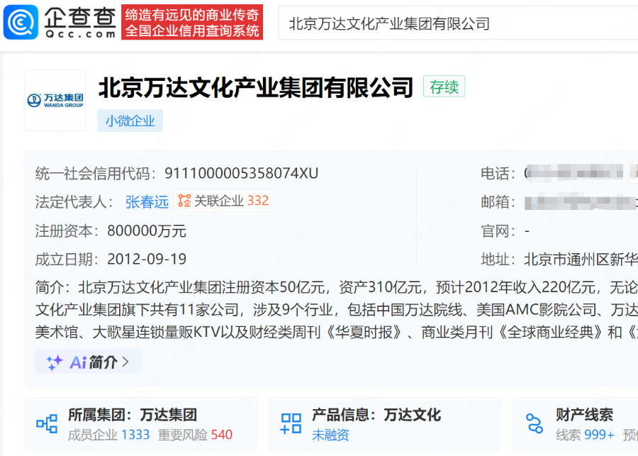 企查查信息显示,北京万达文化产业集团有限公司成立于2012年9月,法定代表人张春远,注册资本80亿元,由大连万达集团股份有限公司全资持股。