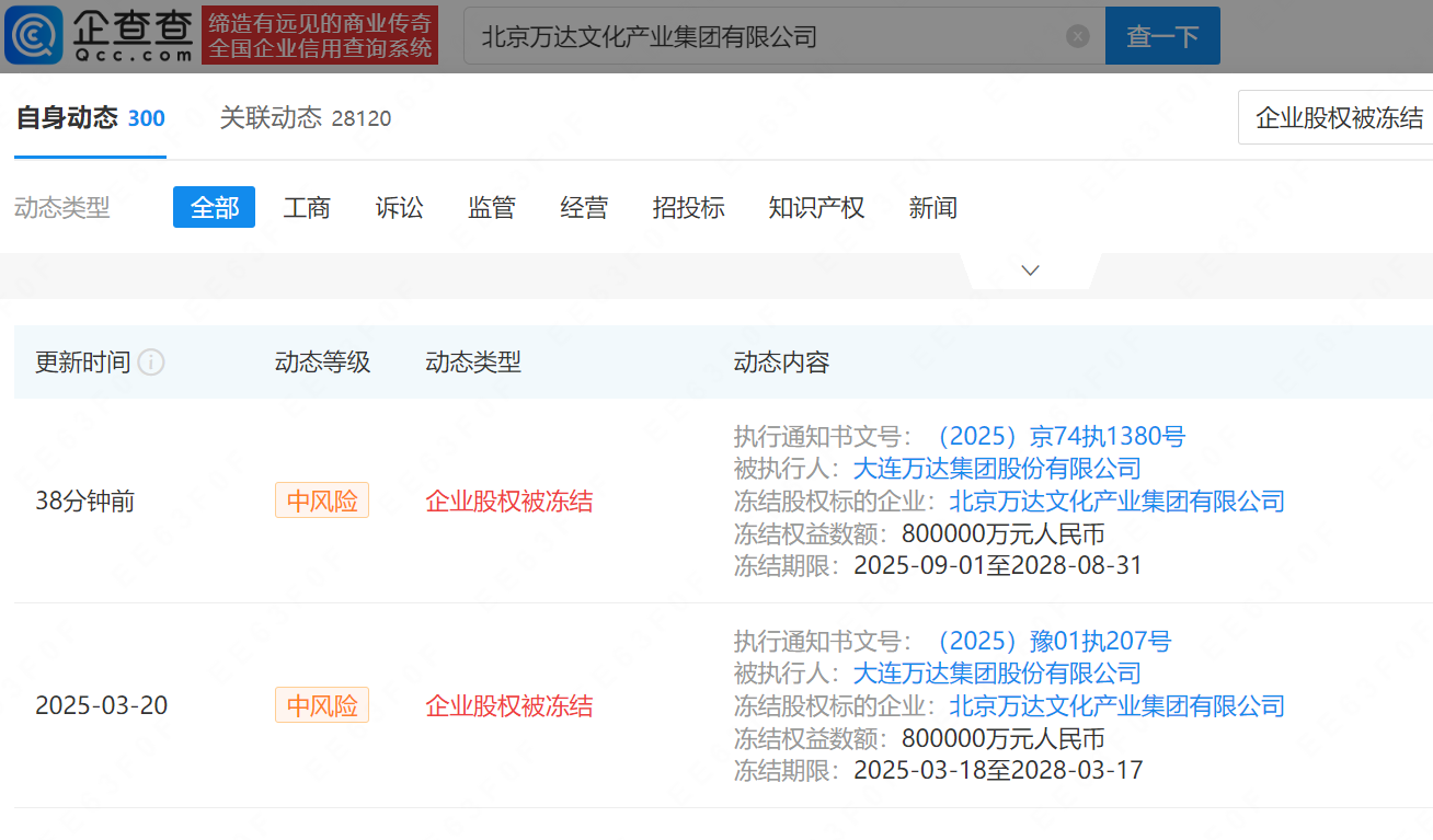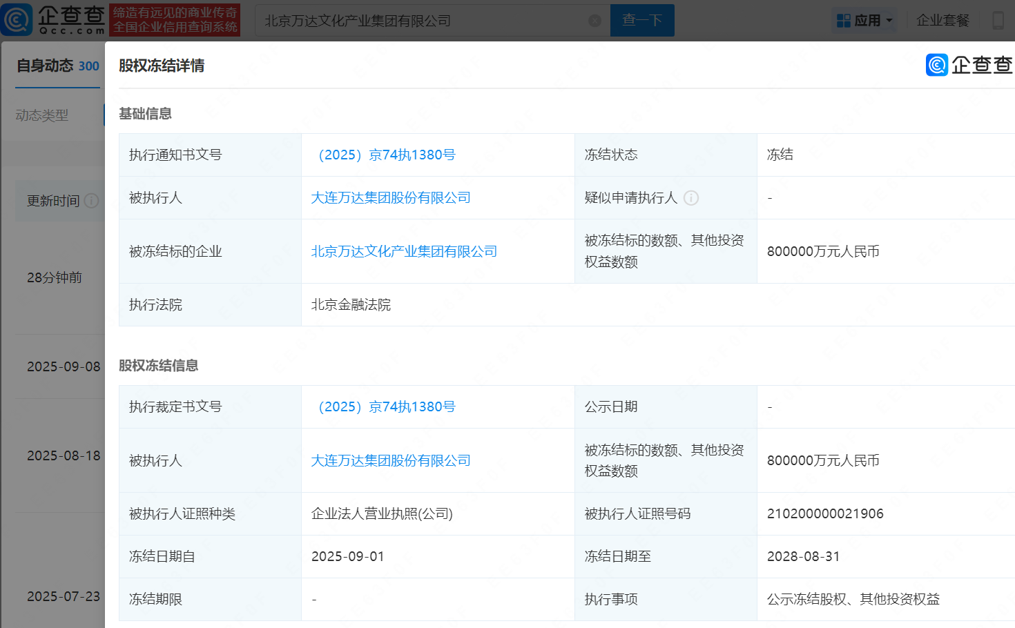 21财经·南财快讯记者注意到,企查查APP显示,近日,北京万达文化产业集团有限公司新增1条股权冻结信息,被执行人为大连万达集团股份有限公司,冻结股权数额为80亿元,冻结期限为2025年9月1日至2028年8月31日,执行法院为北京金融法院。