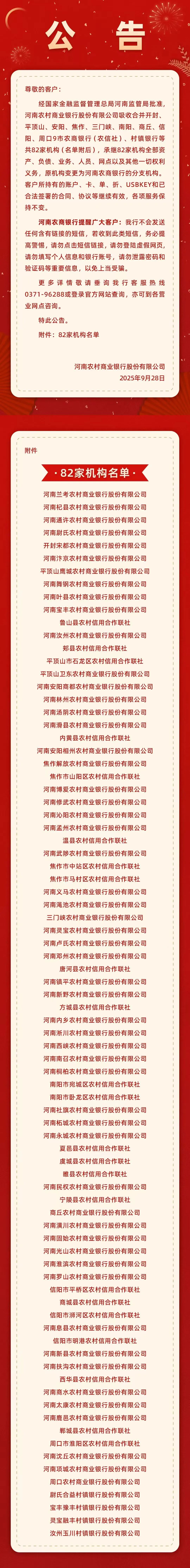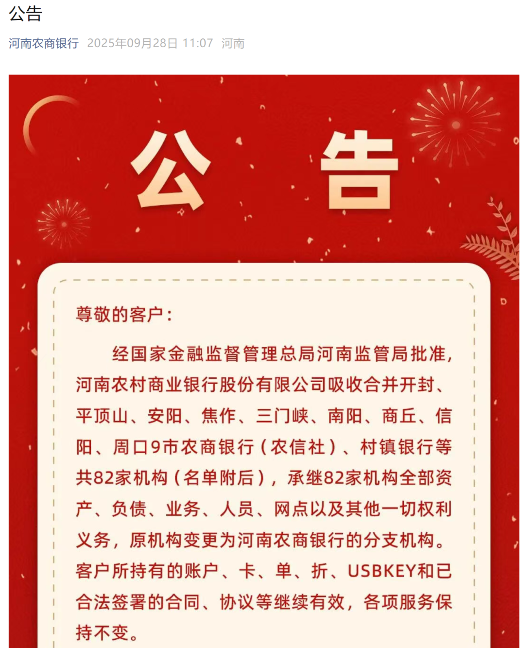9月28日,河南农商银行发布公告称,经国家金融监督管理总局河南监管局批准,河南农村商业银行股份有限公司(以下简称河南农商银行)吸收合并开封、平顶山、安阳、焦作、三门峡、南阳、商丘、信阳、周口9市农商银行(农信社)、村镇银行等共82家机构。