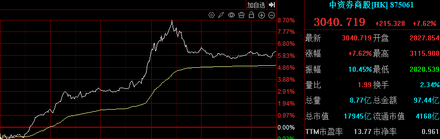 A股券商股午后持续走强,广发证券、华泰证券、国盛金控涨停,中信证券等大幅冲高。港股市场中资券商股亦大爆发,中资券商股指数一度大涨近9%。