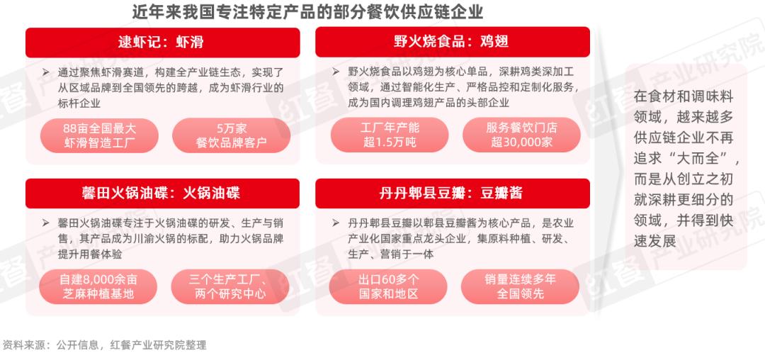 随着餐饮市场的竞争加剧,餐饮品牌加速调整策略,通过打造“爆品”、精细化运营等形成差异化优势。在此背景下,餐饮企业的需求越来越多元化,对上游供应链企业提出更专业化的要求,如寻求更高品质的产品和定制化的爆品解决方案。这也推动了上游供应链的细分化趋势进一步深化,供应链领域不断涌现出“单打冠军”。
