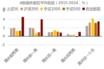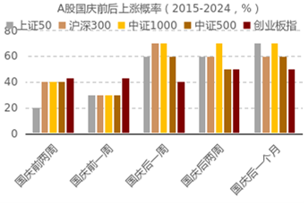 A股国庆节前后市场表现同样呈现出一定的日历效应。具体来说,国庆节前市场交投相对清淡,部分资金在避险需求下流出,导致市场表现不佳。然而,国庆节后市场风险偏好改善,主要指数往往迎来反弹。从过去十年A股国庆节后一周表现来看,上证指数、沪深300、中证1000指数上涨概率均超60%。从2007年以来的数据统计看,万得全A在国庆节后5个交易日区间上涨概率达78%。