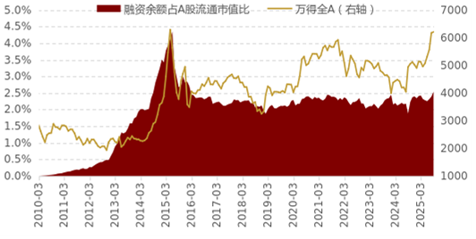 8月中旬以来融资余额持续稳定在2万亿以上运行。截至2025/9/18融资余额达到2.39万亿,绝对规模超过2015年6月历史高点,但是从相对规模看融资余额占A股流通比值仅2.54%(历史以来90%分位),距离2015年高点4.73%仍有距离。