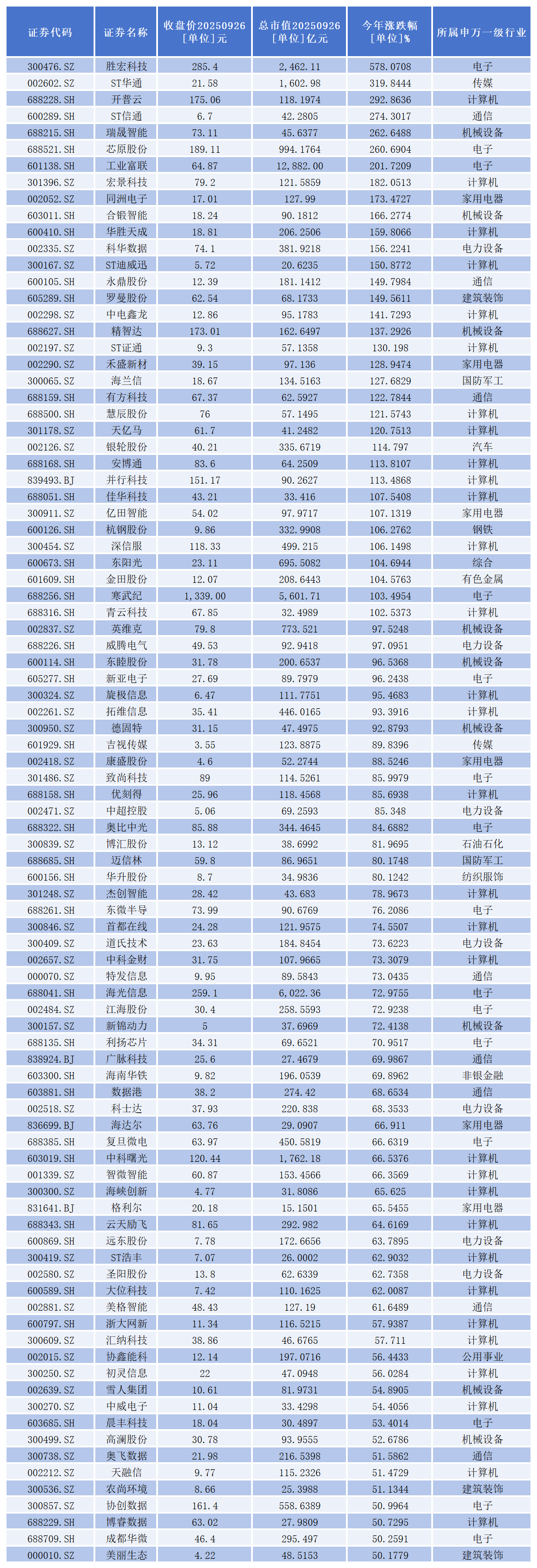 从二级市场表现看,今年以来,股价涨幅超过50%的有91家,其中,34家成功实现翻倍,具体包括:
