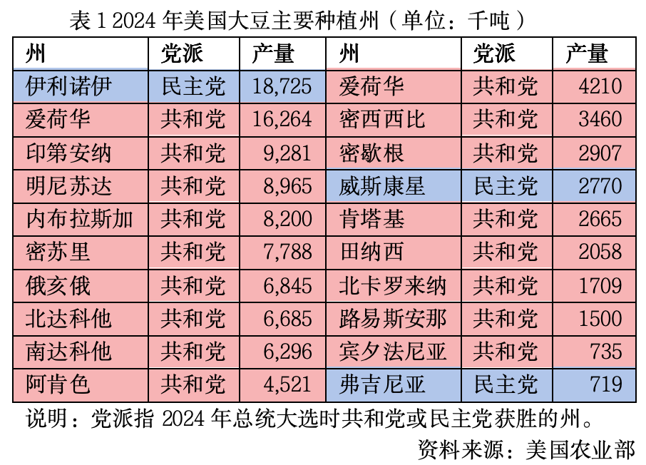 在历次选举中,摇摆州的支持常常是政党能否入主白宫的关键。2024年大选时,美国公认的摇摆州为亚利桑那、佐治亚、密歇根、内华达、北卡罗来纳、宾夕法尼亚和威斯康星,其中密歇根、北卡罗来纳、宾夕法尼亚和威斯康星正是大豆主要生产州。
