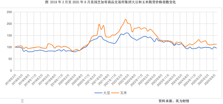 如图所示,自2022年创下历史新高以来,CME大豆和玉米期货主力合约价格指数(令2018年2月的大豆价格1055.00和玉米价格374.5等于100)持续呈现缓慢下跌的趋势,目前价格指数已回落至几年前的水平。