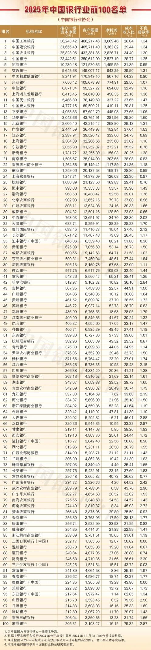 近日,中国银行业协会发布《2025年中国银行业前100名单》,该榜单按照核心一级资本净额对商业银行进行排序,全面呈现银行业发展现状。