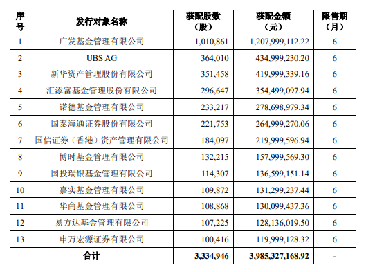《报告书》显示,寒武纪本次发行对象最终确定为13家,涵盖基金、券商、合格境外机构投资者(QFII)、保险等;其中,广发基金管理有限公司获配股数最多,约101万股,获配金额对应12.08亿元,也是唯一获配金额超10亿元的机构;UBS AG(瑞士银行)获配股数次之,约36.4万股;新华资产管理股份有限公司获配约35.15万股居第三。