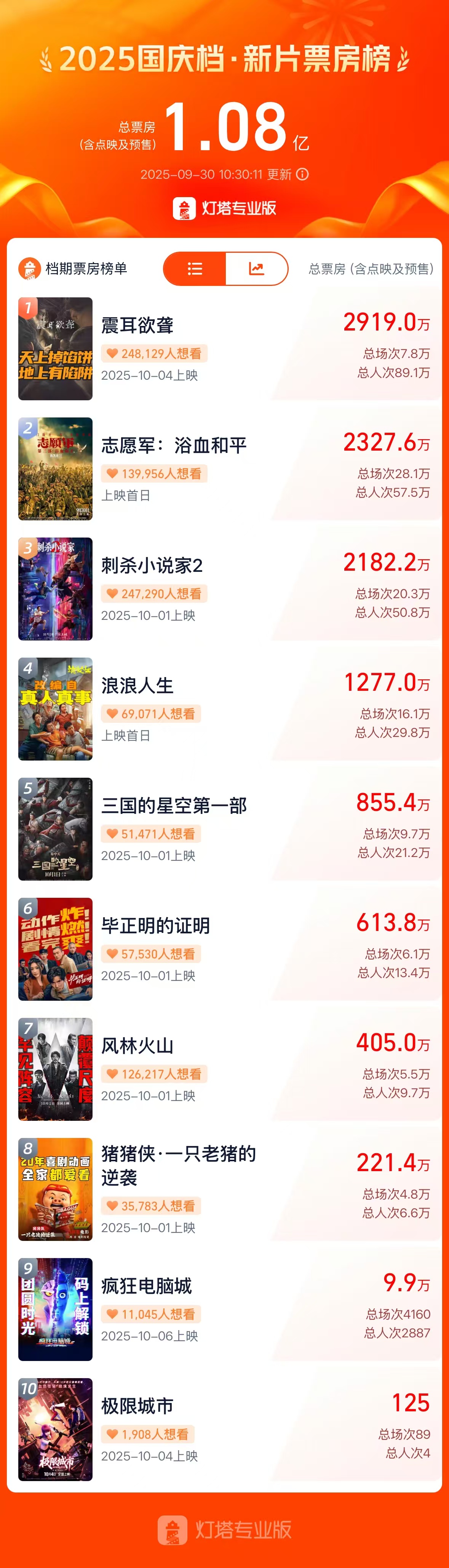 据灯塔专业版数据,截至9月30日10时30分,2025国庆档新片总票房已破亿(含点映及预售)。《震耳欲聋》《志愿军:浴血和平》《刺杀小说家2》暂列前三位。
