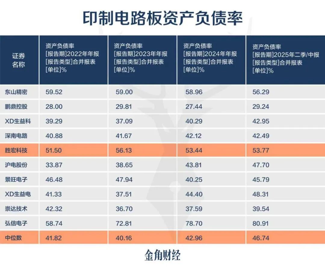 2022-2024年,胜宏科技的资产负债率分别为51.5%、56.13%、53.44%,均超过头部企业中位数10个百分点左右。2025年中,胜宏科技的资产负债率也达到53.77%,同样高于头部企业中位数。