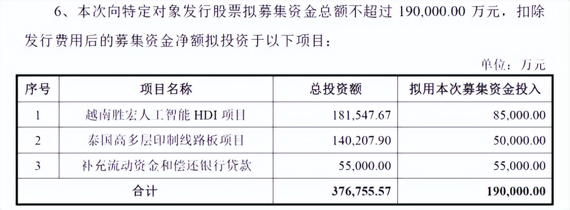 但热闹之下,隐忧也不小。这场定增本质上主要是胜宏科技为海外项目融资,19亿元的募资中,有13.5亿元将投向越南和泰国两大项目,而这两个项目的总投资更是高达32.2亿元。