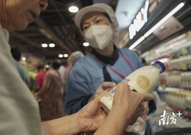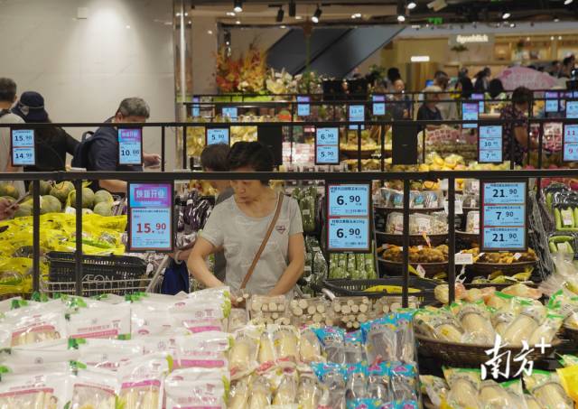 手推车内,除了生鲜蔬果、应节食品等刚需产品,鲜花、饮料等也成为“新宠”。天河城店店长张国镇介绍,为迎接国庆中秋假期,焕新开业的天河城店推出多项优惠措施,以促进市民消费。