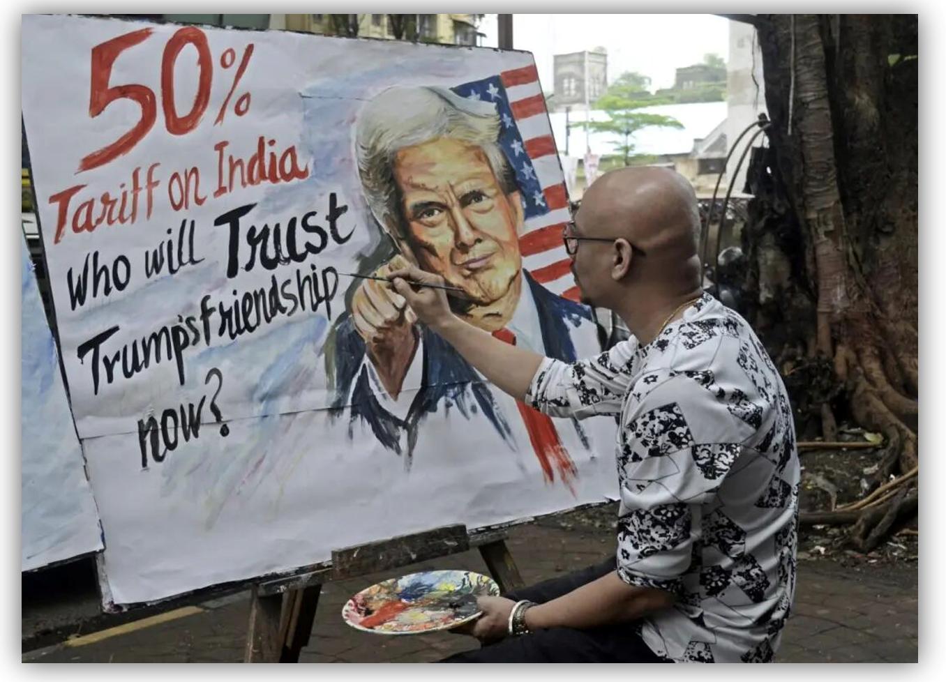印度孟买,一位艺术家创作抗议特朗普对印加关税的作品。