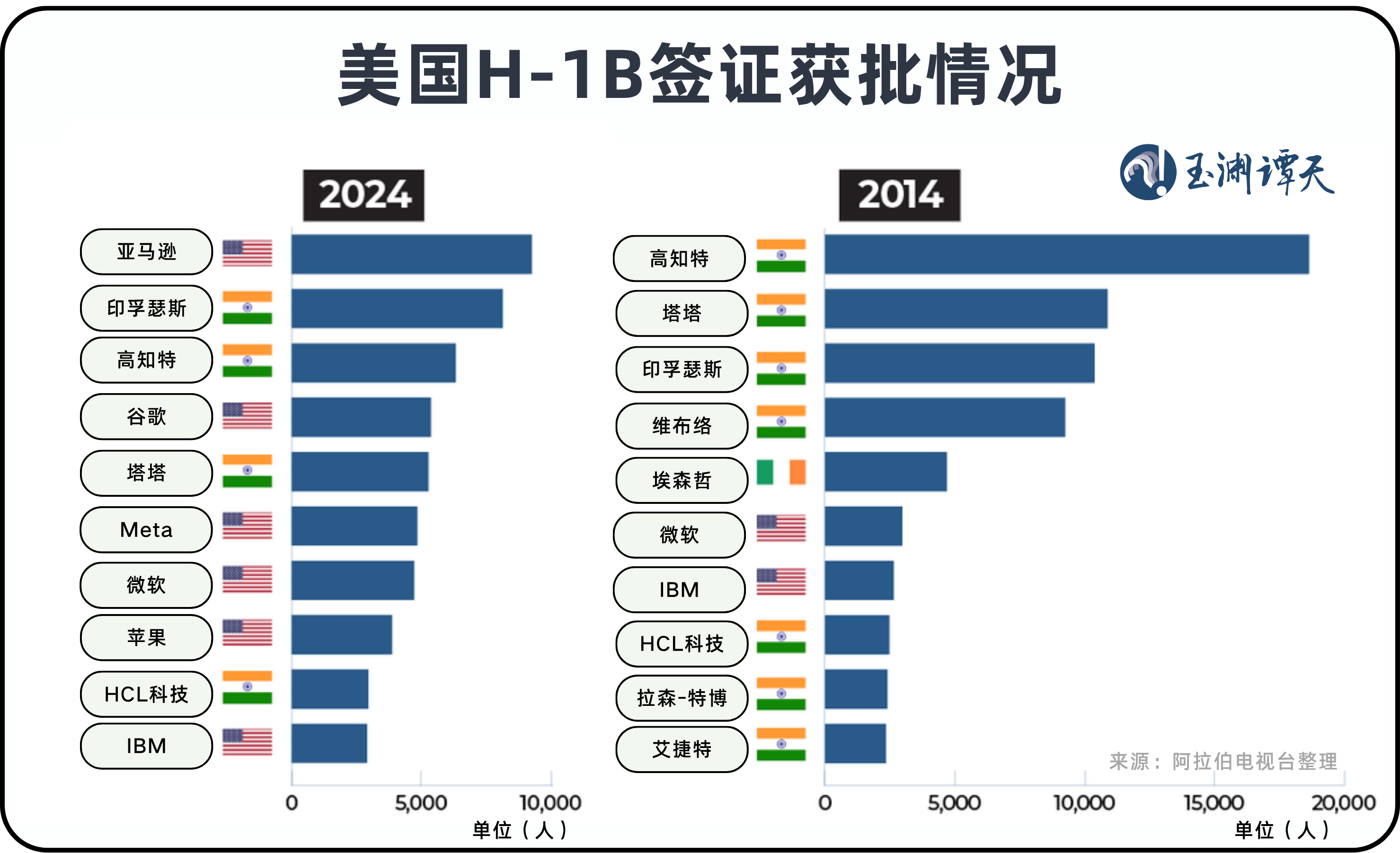 美国本土科技巨头,直接招收印度工程师。亚马逊、谷歌、苹果、微软等,因为人工智能、云计算爆发,对高技能外籍人才的需求显著增加,直接申请H-1B的数量也有所增加。