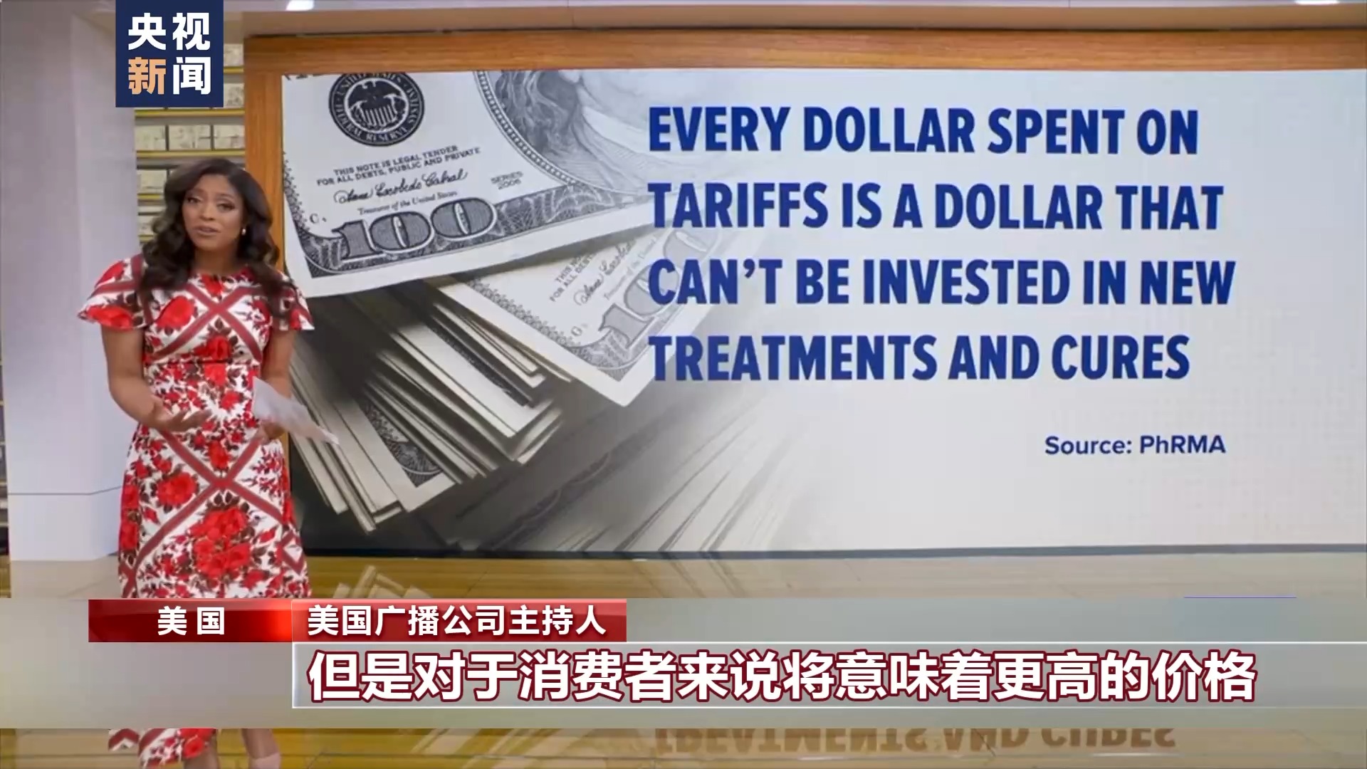 美国广播公司主持人:美国药物研究机构和制药厂商协会指出,在关税上多花的每一美元,都无法用于投资新治疗方法的开发。政府说加关税是为了国家安全、为了提振美国制造业,但是对于消费者来说,将意味着更高的价格。