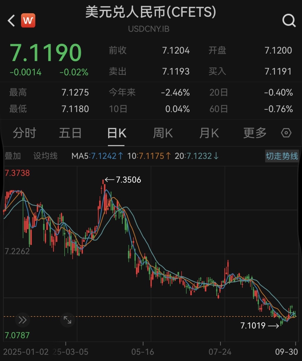 人民币对美元即期汇率日间收盘价从去年末的7.2988升至2025年9月30日的7.1186,累计升值超2.46%,其中三季度升值超0.65%。