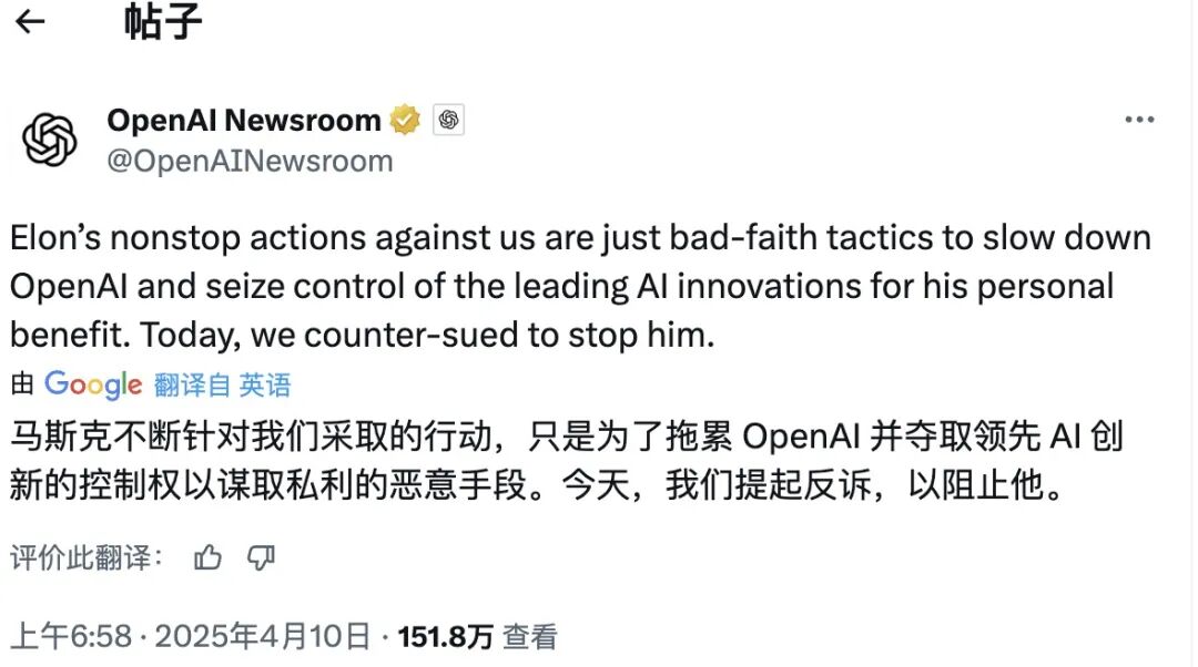 4月, OpenAI也曾发布声明表示对马斯克提起反诉,称马斯克针对 OpenAI的行为只是为了拖累 OpenAI以谋取私利的恶意手段。
