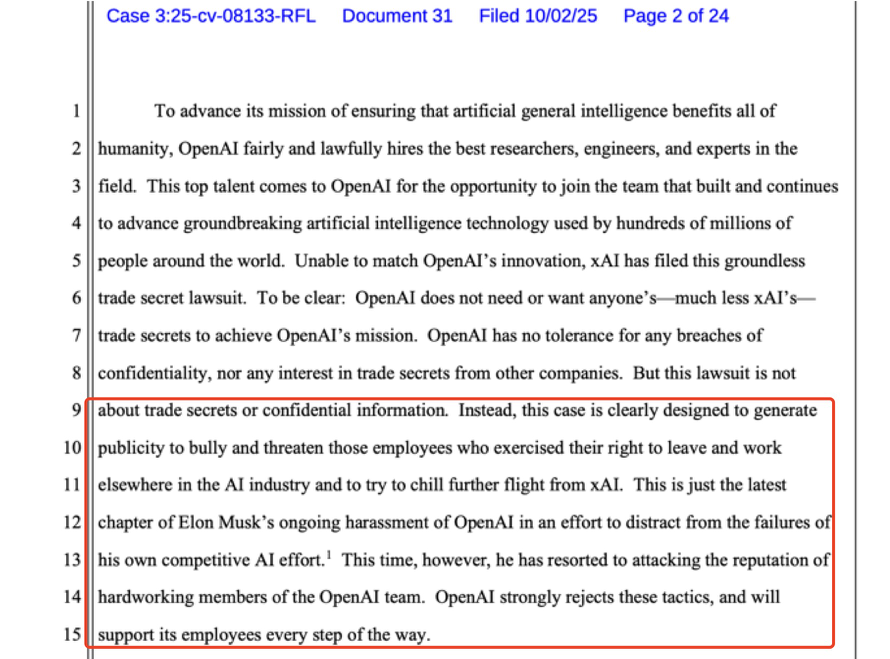 此前,马斯克旗下AI公司xAI曾对OpenAI发起多个诉讼,包括指控OpenAI诱导前xAI员工窃取并分享xAI的商业机密,违反了相关法律。