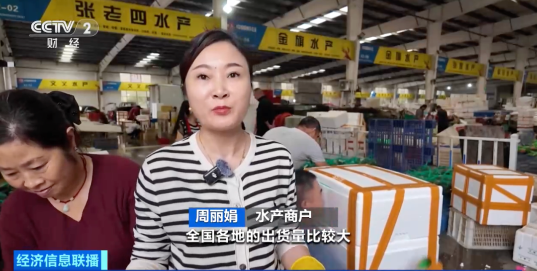 水产商户 周丽娟:全国各地的出货量比较大,我们这次发往全国各地的货,有上海、江苏、浙江 …… 到处都有,在这个节日期间,每天出货量有 3000 斤左右。