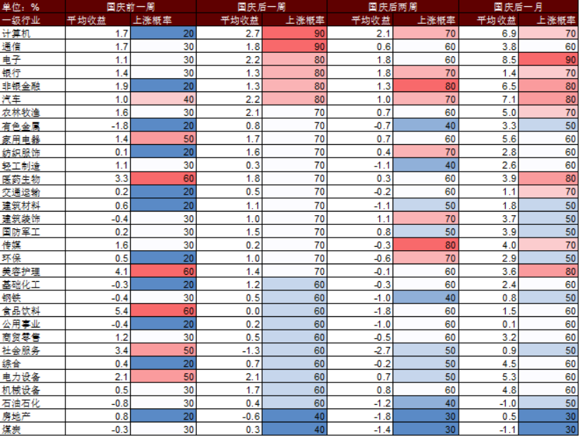 (来源:财联社 原标题:国庆节后A股怎么走?以史为鉴这两大行业上涨概率更高,核心受益标的梳理)