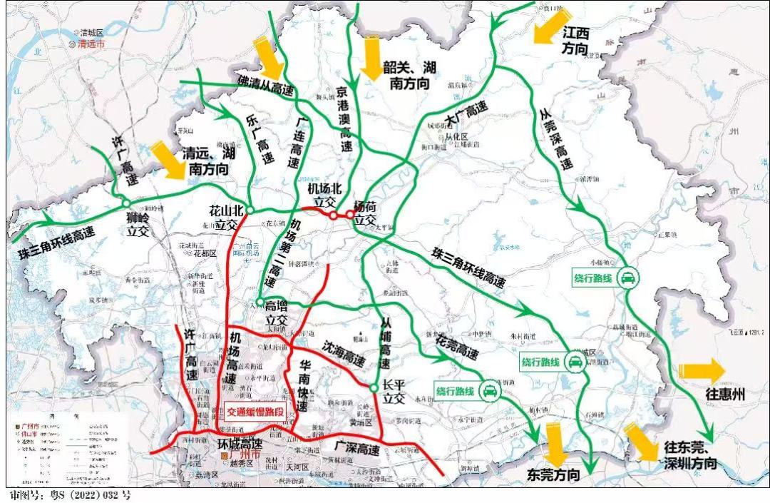 建议来自韶关、湖南方向的车主尽量避开高峰时间返城,高峰期返城的车主可以通过国道G106等地方道路或许广高速、广连高速(连接机场第二高速)进行绕行,避开机场高速行车缓慢路段。