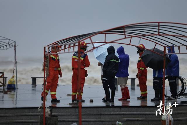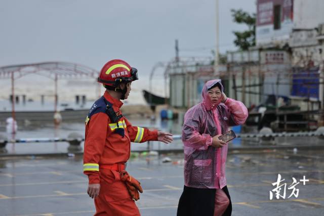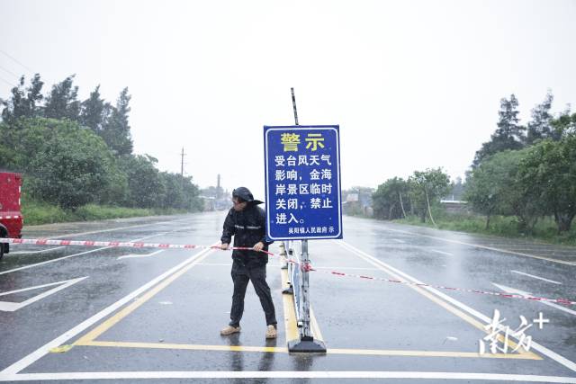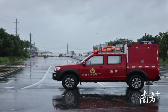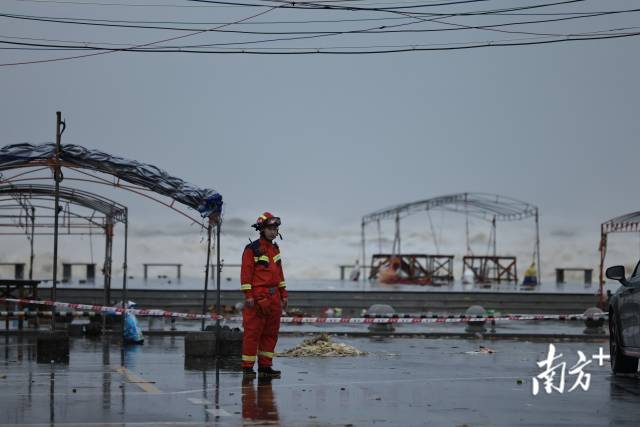 记者在湛江市吴阳镇金海岸海边看到,受台风外围环流影响,海面已掀起约五米高的巨浪。消防员与相关工作人员正在对沿海警戒区域进行封闭,并对沿线设施实行关停管理,同时劝导靠近海边的群众尽快撤离。消防人员提醒,台风天气海况恶劣,请市民不要外出观海,注意安全。