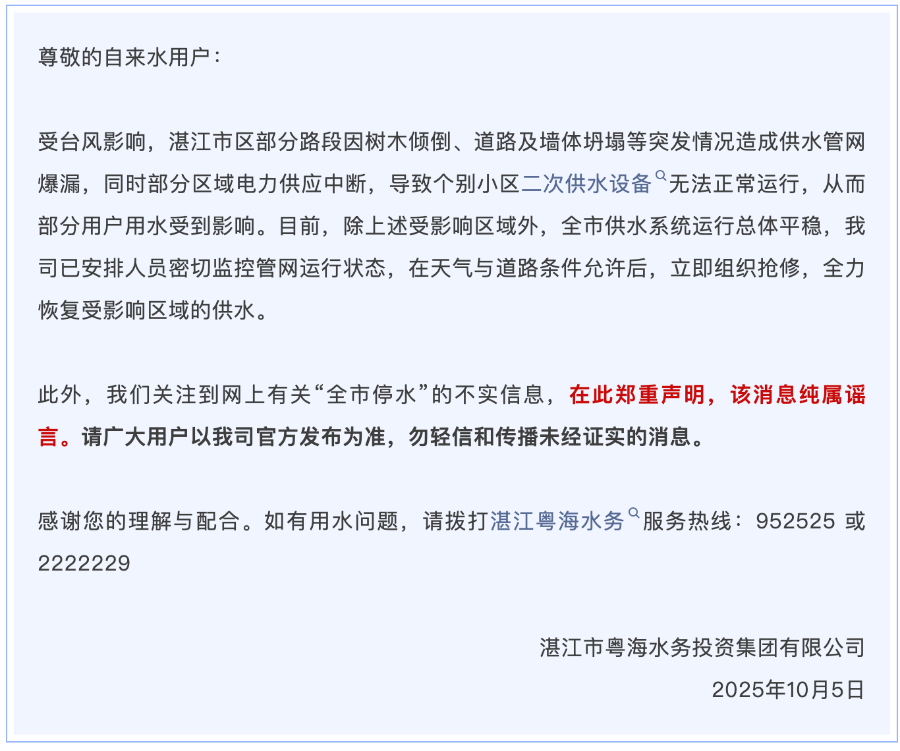 10月6日,《辟谣财知道》注意到,昨日晚间,湛江市粤海水务投资集团有限公司通过“网信湛江”公众号发布郑重声明称,此前网络上有关“全市停水”的信息不实,纯属谣言。