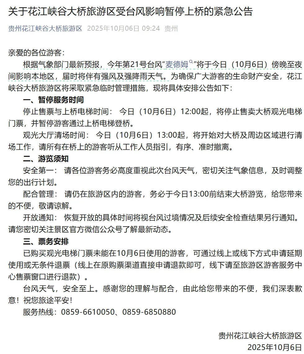 根据气象部门最新预报,今年第21号台风“麦德姆”将于今日(10月6日)傍晚至夜间影响本地区,届时将伴有强风及强降雨天气。为确保广大游客的生命财产安全,花江峡谷大桥旅游区将采取紧急临时管理措施。