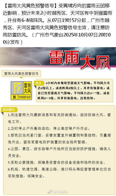 据@广州天气,受黄埔方向的雷雨云团移近影响,预计未来2小时越秀区、天河区有中到强雷雨,并伴有6-8级阵风。从07日19时57分起,广州市越秀区、天河区雷雨大风黄色预警信号生效,请注意防雨防雷防风。