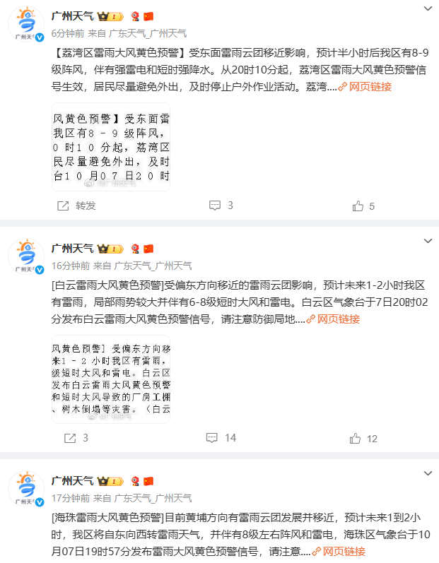 截至发稿,海珠区、白云区、荔湾区雷雨大风黄色预警信号也已生效。