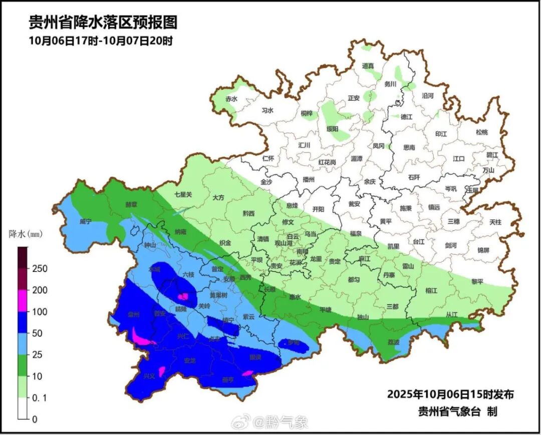 据贵州省气象局昨日(6日)预报,6日午后到7日白天,六盘水市、黔西南州、安顺市西部和南部、黔南州南部边缘局地有大到暴雨(40-70mm),个别乡镇有大暴雨,其余地区多云有分散阵雨,中西部和南部地区有4-6级偏东风,阵风可达7级。明天夜间到8日白天,省的西部地区阴天间多云有阵雨,其余地区多云有分散阵雨。8日夜间到9日白天,省的西部地区多云有分散阵雨或雷雨,其余地区多云。