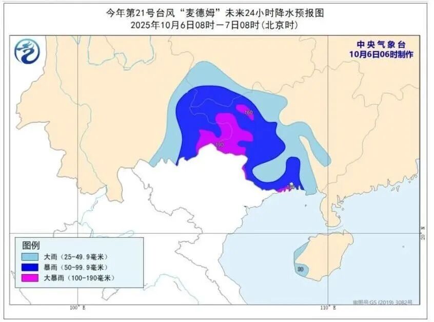 昨天(6日)上午10时,中央气象台继续发布台风蓝色预警,据降水预报,6日14时至7日14时,广西西部和南部、贵州西南部、云南东部等地有大到暴雨,其中,广西西部、云南东南部等地部分地区有大暴雨(100~200毫米)。昨天(6日)18时,中央气象台解除台风蓝色预警,降水预报提到:6日20时至7日20时,广西西部、贵州西部、云南东部和南部等地有大到暴雨,部分地区有大暴雨(100~150毫米);上述部分地区伴有短时强降水,最大小时降雨量20~40毫米,局地可超过50毫米。